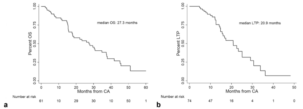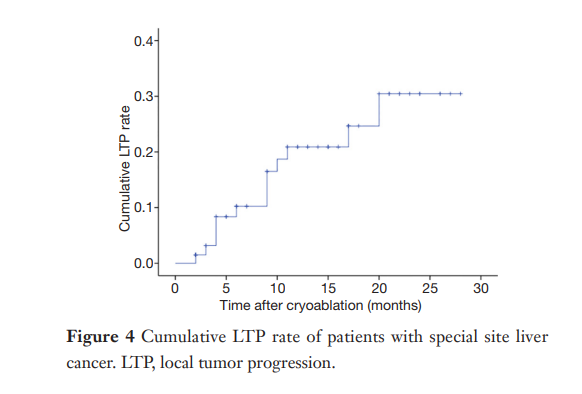 ③ 总生存曲线和局部肿瘤进展曲线:冷冻消融后中位生存时间为 27.3 个月,中位局部肿瘤进展时间为 20.9 个月。